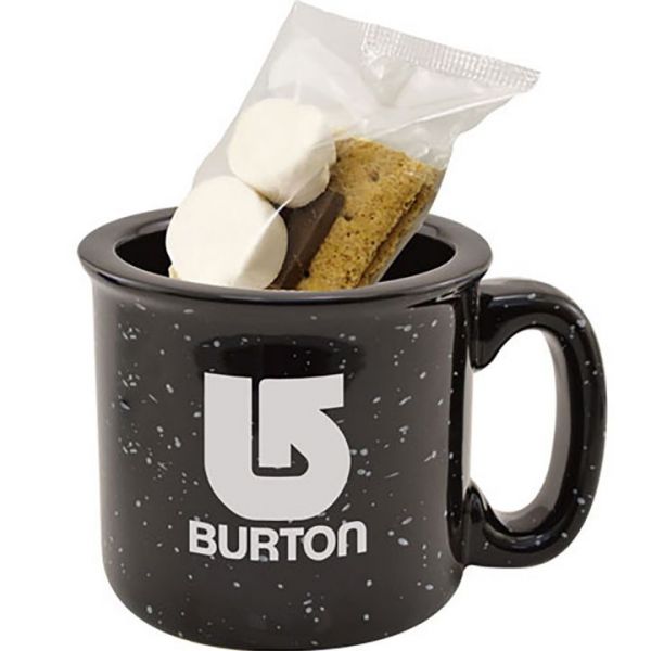 15oz camping mug with smores. Hand wash only. 1 .20 oz chocolate square. 2 half marshmallows. 1 graham cracker (broken in half). Price includes one colour, one location imprint.