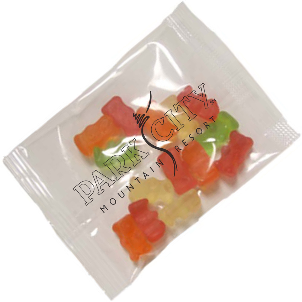 1oz. Gummy Bears Goody Bag. Perfect for parades, trade shows or any event where you want to give an inexpensive, colorful and delicious treat. Select from a 1-4 spot color direct imprint or a 1-4 color process label for the same price! Direct imprint bag dimensions: 4.929" x 2.5". Labeled bag dimensions: 3" x 4". Non melt product. Price includes full colour print on label.