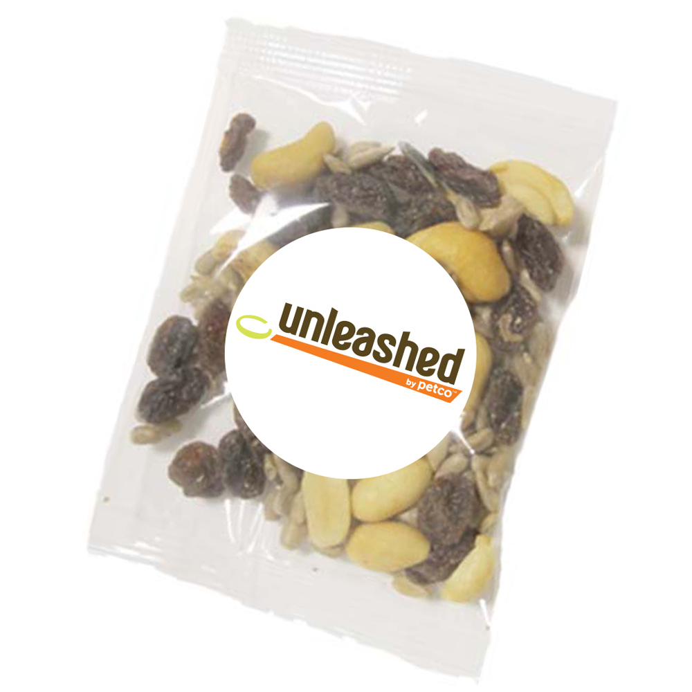 1oz. Raisin Nut Mix- Goody Bag. Perfect for parades, trade shows or any event where you want to give an inexpensive, colorful and delicious treat. Select from a 1-4 spot color direct imprint or a 1-4 color process label for the same price! Direct imprint bag dimensions: 4.929" x 2.5". Labeled bag dimensions: 3" x 4". Non melt product. Price includes full color imprint on label.