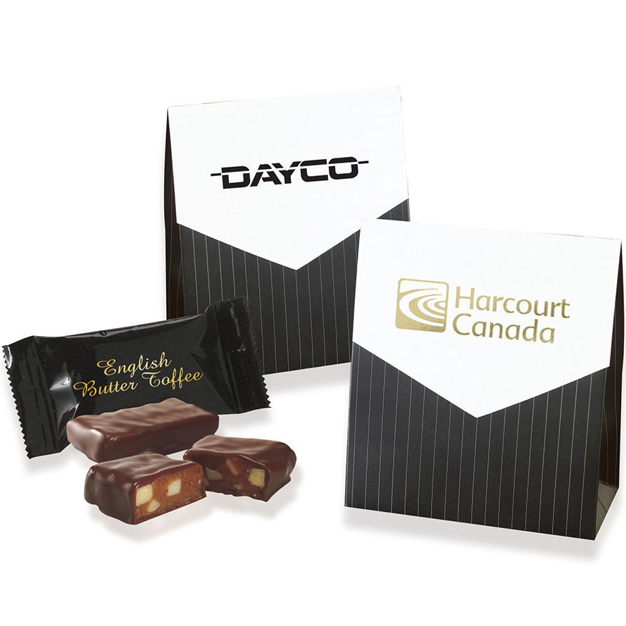 Add a formal touch to any occasion with this pinstriped mini treat pouch! Filled with two delicious pieces of English Butter Toffee candy, this product is perfect for any company promotions, executive gifts or any other event where you want to give an inexpensive and delicious treat. With a one color imprint available, add your name, logo or message on the pouch and treat yourself to a great marketing campaign!