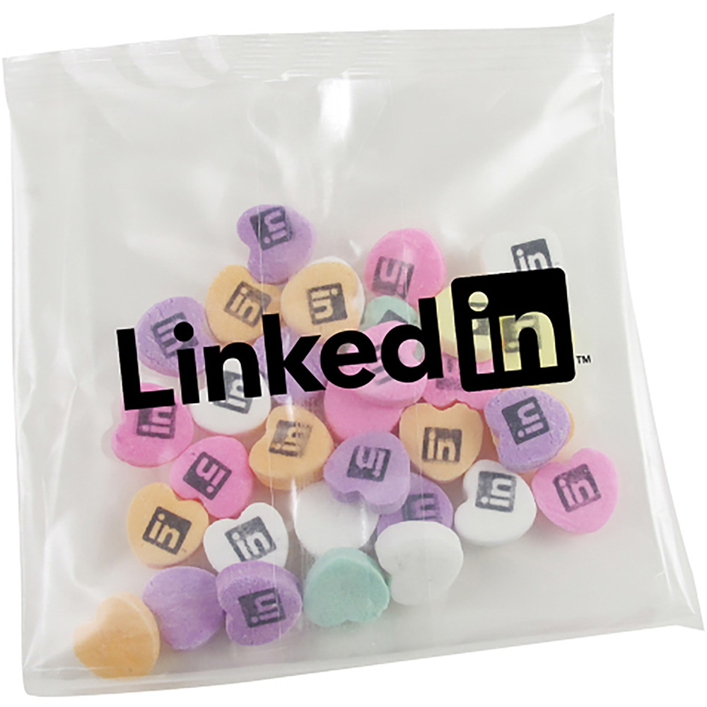 Grab one of our 2 oz. handfuls of imprinted conversation hearts and begin to feel the love! They come in either a labeled bag, measuring 5” x 5”, or one that has a direct imprint of your company logo, measuring 4.929” x 4”. Both are great ways to show off your brand to everyone. Give this out at a tradeshow, conference, or special event involving connections of the heart. These are sure to get conversations going about you! Price includes full color imprint.