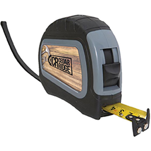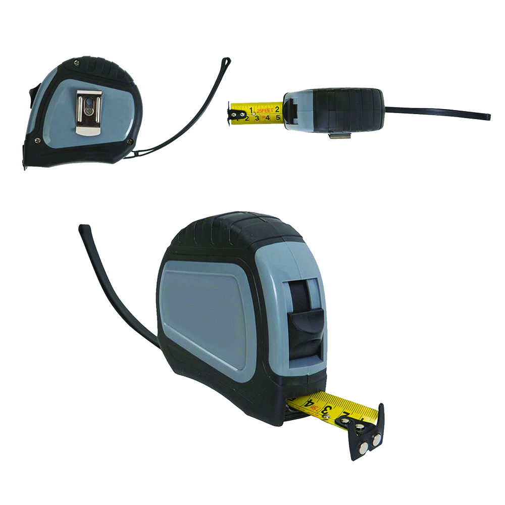 Rubberized finish makes handling easy. Perfect for carpenters, contractors and more. 25 foot pull and press locking tape measure. Convenient magnetic dual end hook to help hold it in place and make measuring easier. Tape is two sided with inches and centimeters on both sides. Tape is 1" scale with 1/16" increments. Includes wrist strap and belt clip. Price includes one color imprint.
