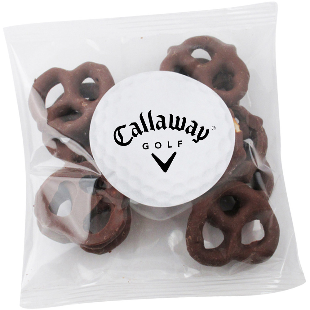 2oz. Milk Chocolate Mini Pretzel Handfuls. Handfuls are just the right amount to satisfy a sweet or savory craving. Select from a 1-4 spot color direct imprint or a 1-4 color process label for the same price! Direct imprint bag dimensions: 4.929" x 4". Labeled bag dimensions: 5" x 5".