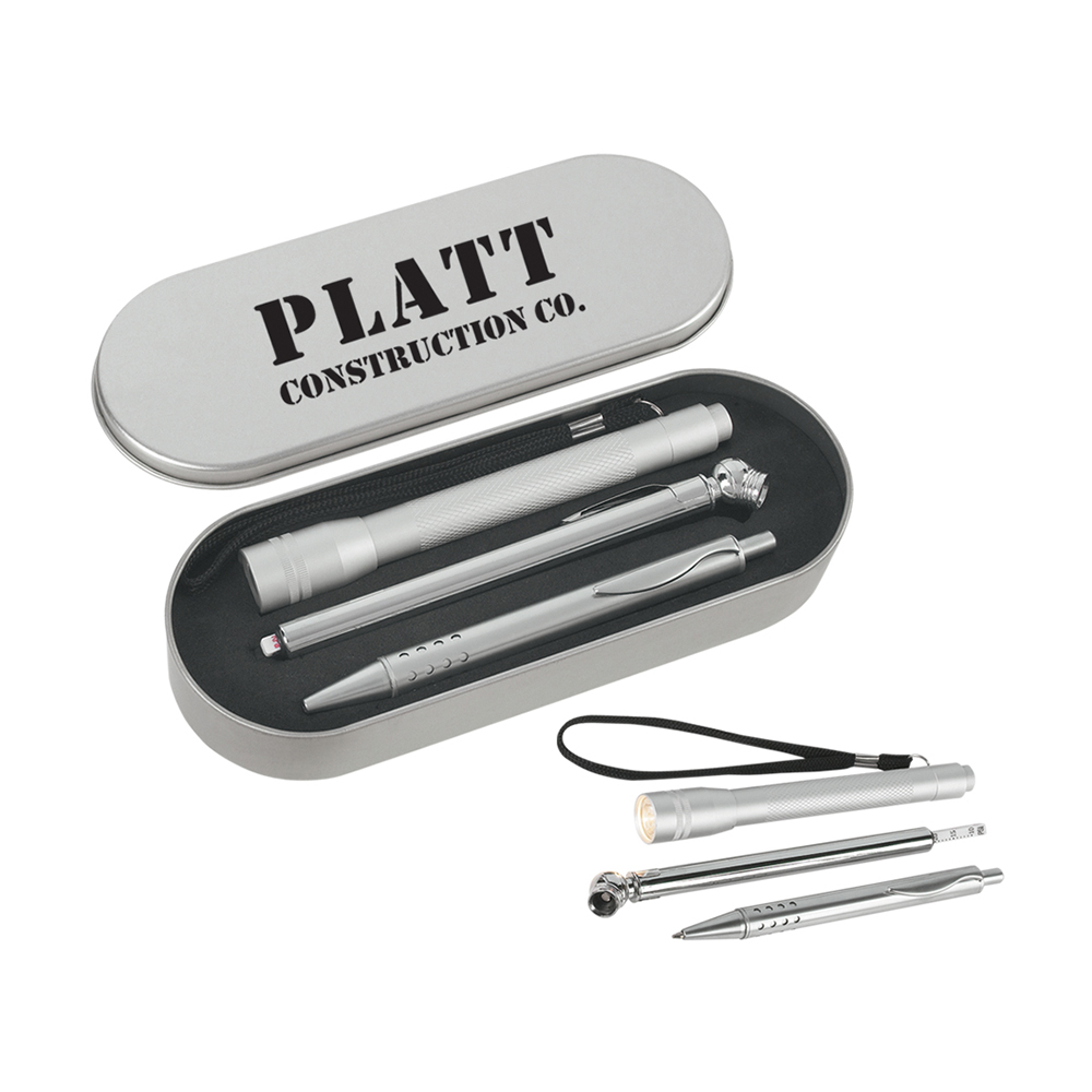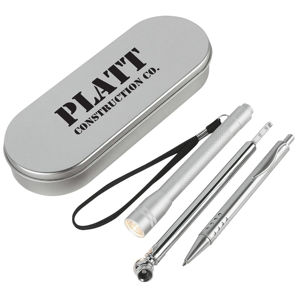 Tire Gauge, Max: 50 PSI. Ball Pen With Black Ink. Aluminum Flashlight. Batteries Included.