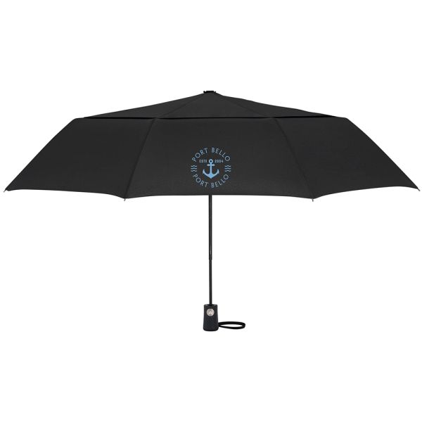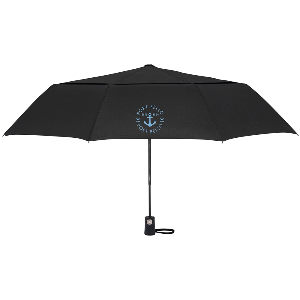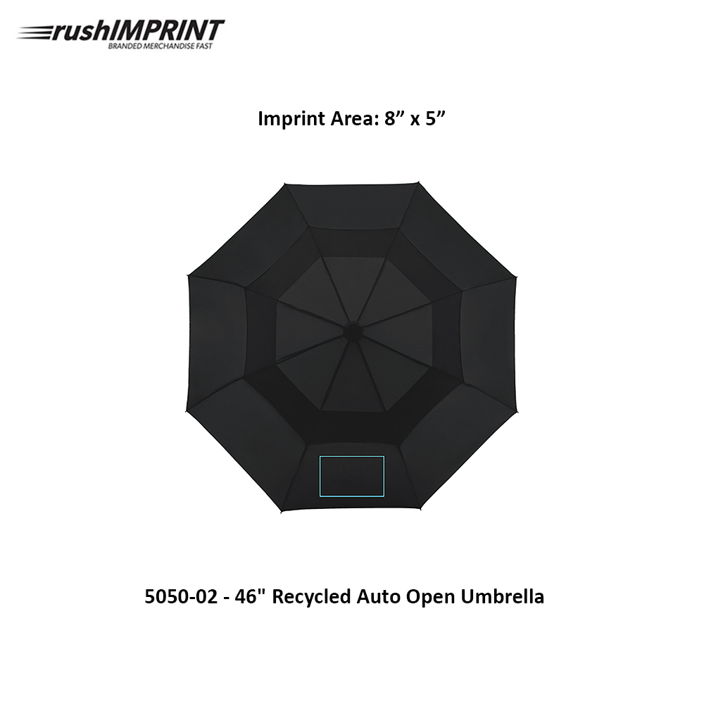 Stay dry under this eco-friendly 46" Auto Open Umbrella! This umbrella is easy to use and travel with. Made with metal and fiberglass, this sturdy umbrella also features a vented canopy, an ABS handle for extra comfort, and folds to 12.5". Comes with an RPET sleeve packed in an FSC pouch. Wind rated up to 25mph. Additional Panel Decorating available Please call for Pricing. Price includes one colour, one location imprint.