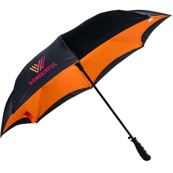 The Rebel is an umbrella featuring a revolutionary design that allows the water to push away when closing, making it easy when entering or leaving a car or through a door and keeping you dry in the process. Plus, the inverted closing action keeps the dry side of the umbrella on the outside when brought indoors. Specs include a 48″ arc, automatic closing mechanics, pongee fabric and a straight rubberized grip handle. Fabric Material: Pongee. Shaft Material: Steel. Ribs Material: Fiberglass. Handle Material: Rubberized. Handle Style: Pistol Grip. Umbrella Mechanics: Manual Open/Automatic Inverted Close. Special Features: Double Cover, Inverted. Price includes one color, one location imprint.
