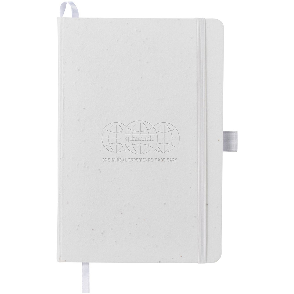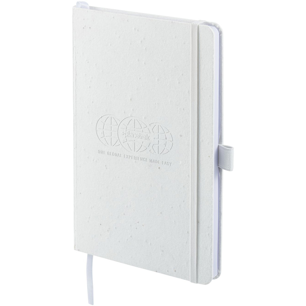 The 5.5'' x 8.5'' FSC Recycled Seed Paper Bound Journal features a biodegradable seed paper cover - made by mixing paper pulp with daisy seeds. The journal also includes 80 sheets of FSC- Certified Recycled lined paper. An elastic band, color-matching page marker ribbon, and a document pocket in the back provide exceptional organization when you're on the move. The journal also features an integrated pen loop to securely hold your favorite pen. Through a partnership with 1% For The Planet, one percent of sales of this item are donated to environmental nonprofits. Price includes debossing.