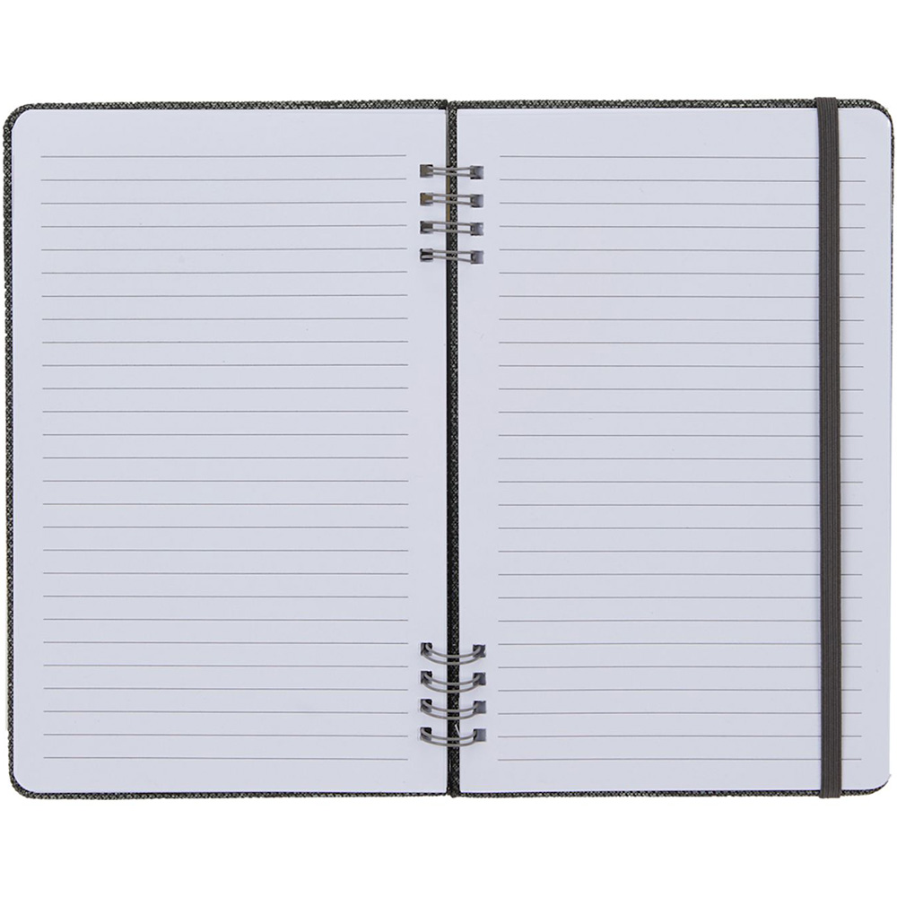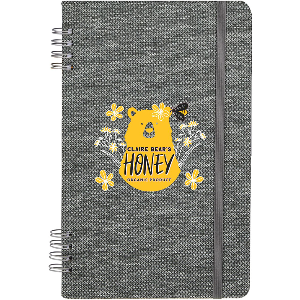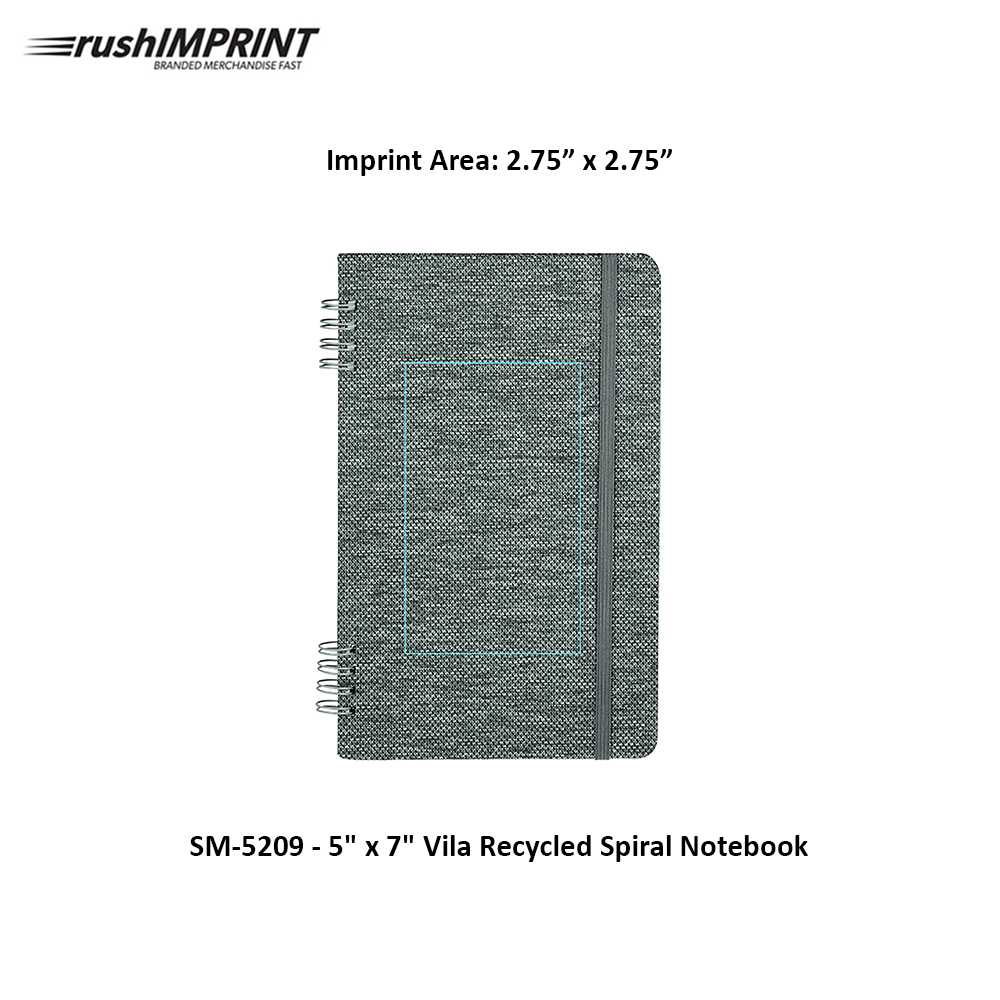 The 5'' x 7'' Vila Recycled Spiral Notebook is part of the sustainable, budget-friendly Vila collection, featuring a 100% rPET hard cover with spiral binding. Includes an elastic closure and 50 sheets of recycled lined paper. By choosing this notebook, you're making a positive impact on the environment, as one percent of sales are donated to environmental nonprofits through a partnership with 1% For The Planet.. Features. 100% rPET hard cover with spiral binding50 sheets of recycled lined paperElastic closure. Price includes full colour imprint.
