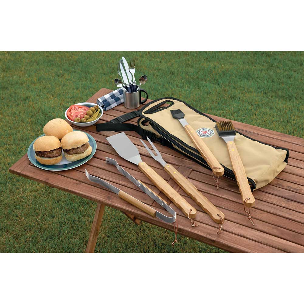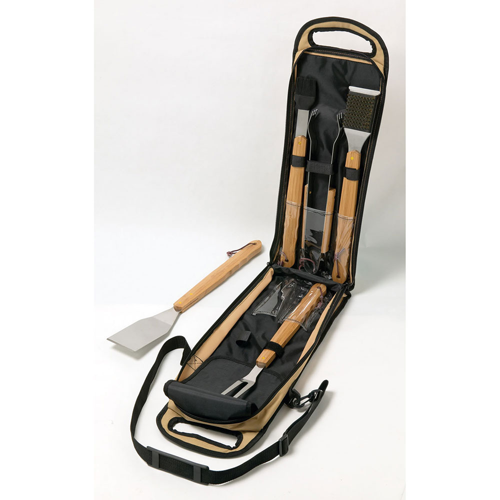 Bamboo BBQ Set Includes Spatula, Tongs, Fork, Silicone Basting Brush and Grill Brush. FDA Compliant Implements. Price includes one colour imprint, one location.