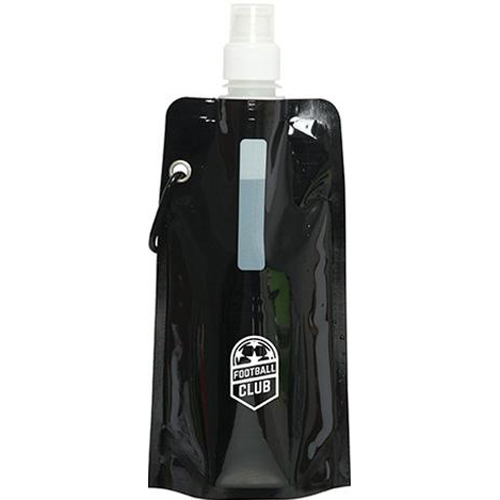 Polyethylene. Collapsible water bag. Holds up to 540 ml. (18 oz.). Plastic cap with twist-off, push-pull lid. Light and compact for easy carrying. Rolls up when not in use. Silver carabiner. Stands upright when filled with liquid. White area to write your name. Personalization not available. Bulk packed. BPA free and FDA compliant. CPSIA compliant. Price includes one colour, one location imprint.