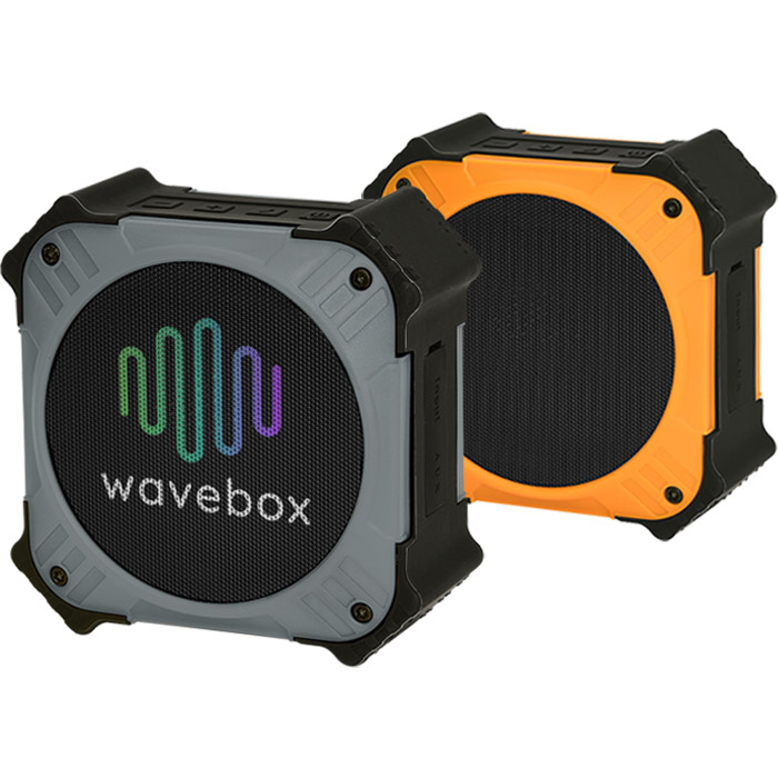 Rugged indoor/outdoor 5 watt Bluetooth speaker with solar panel. Recharge via micro USB cable or high efficiency monocrystalline solar panel. IPX6 Certified rating - waterproof, dust proof and shock proof. Green indicator light turns on when solar charging; off when removed from sunlight. Built-in mic for hands-free calls. Operating range: 33ft/10m. Approx 20 hours of battery life. Approx 21/2 hours USB charging time; 12 hours solar charging time. Connect using Bluetooth 4.2 technology or AUX line-in cable. Includes USB/Micro charging cable, 3.5 mm audio cable, strap, and manual. Includes M8 screw hole on bottom for bike mount (bike mount not included). Price includes full colour imprint.