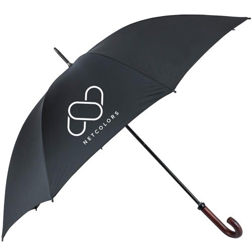 Open a door full of possibilities when you marketing with this custom umbrella! The Doorman umbrella is made of black nylon, so you can create a classic yet stylish item for your business concept, convention, tradeshow or marketing campaign. Features include a manual opening, 60″ arc, black steel shaft and ribs, plus a solid wood hook handle. It’s a great choice for hotels, restaurants, business lobbies and much more. Fabric Material: Nylon. Shaft Material: Steel. Ribs Material: Steel. Handle Material: Wood. Handle Style: Hook. Umbrella Mechanics: Manual Open. Price includes one color, one location imprint.