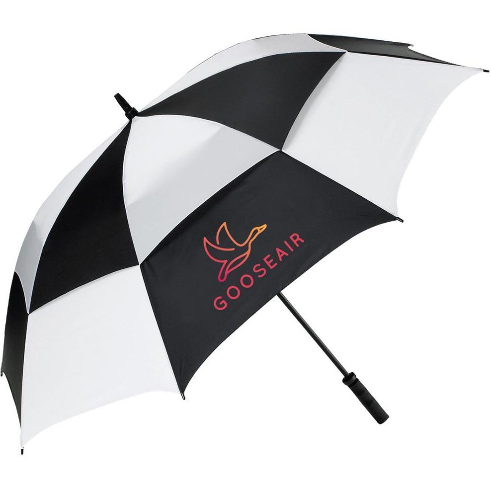 Equip your team with the ultimate golf umbrella for wind and rain! Designed to withstand wind gusts up to 60 mph, the top selling MVP Umbrella features vented canopy technology which helps secure the umbrella by reducing air resistant in strong wind gusts. It’s also made of nylon with a 62″ arc, fiberglass shaft and Duraflex (TM) fiberglass ribs, a black rubber spray pistol grip handle and matching nylon sleeve. A must on the golf course! Sleeve: Matching. Fabric Material: Nylon. Shaft Material: Fiberglass. Ribs Material: Fiberglass. Handle Material: Rubberized. Handle Style: Pistol Grip. Umbrella Mechanics: Manual Open. Special Features: Vented. Price includes one color, one location imprint.