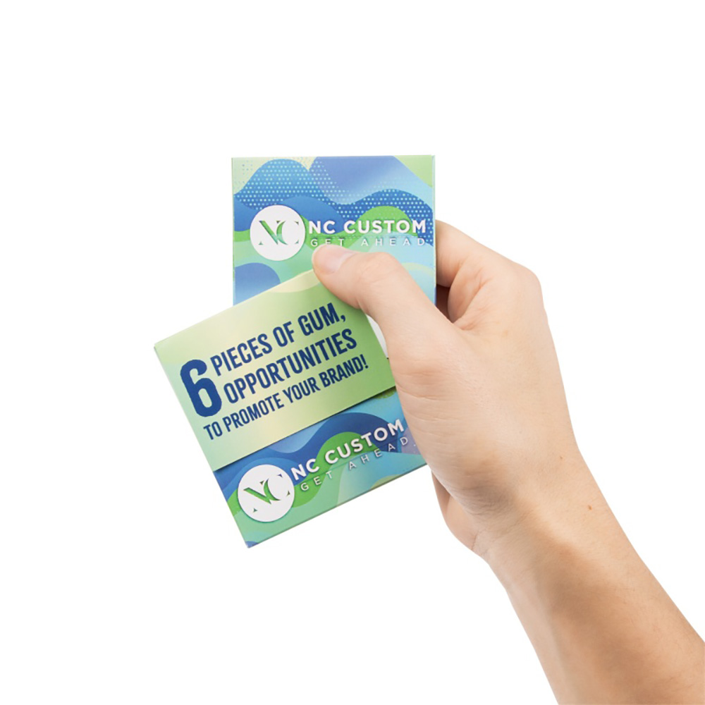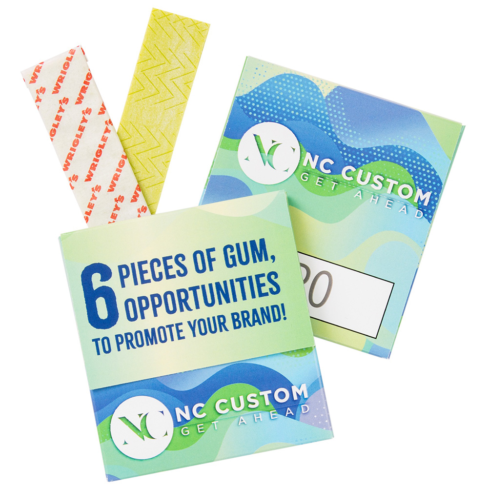 6 Piece Stick Gum Pack. Create a retail look with our full color gum packs. Say everything you need to say about your company or promotion using the front and back imprint areas. Have fun with your artwork and create a visual piece that gives them something to chew on. Price includes full color imprint.