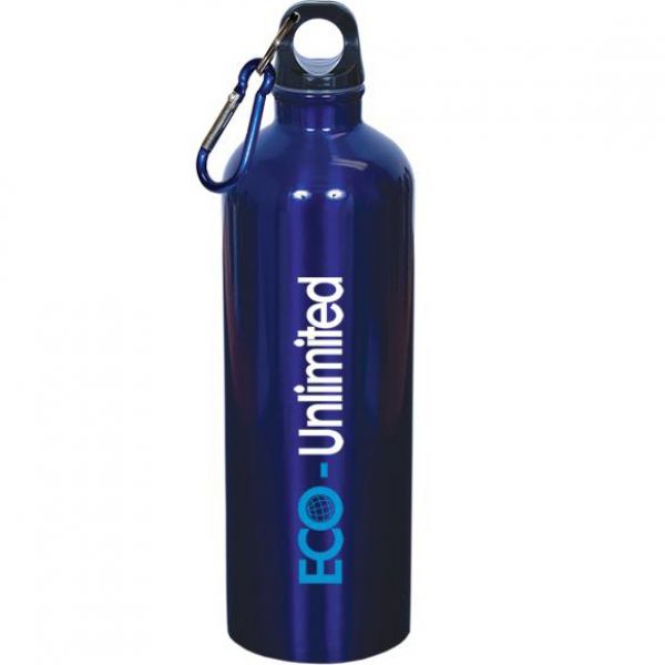 18/8 stainless steel Custom Water Bottle up to 750 ml (25 oz.) capacity. Has Black plastic screw cap with carabineer. Min. of 50 pcs. Personalized Water Bottle comes with 0.4mm single wall construction. BPA free (Bisphenol A) and FDA Compliant. Hand washing recommended. Price includes one colour imprint, one location. Ready within 24-hour production time!
