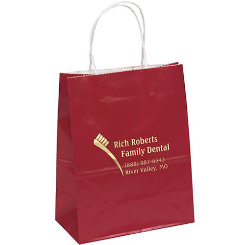 This paper shopper features a glossy finish with a serrated cut top and twisted kraft paper handles. Price includes foil stamp.