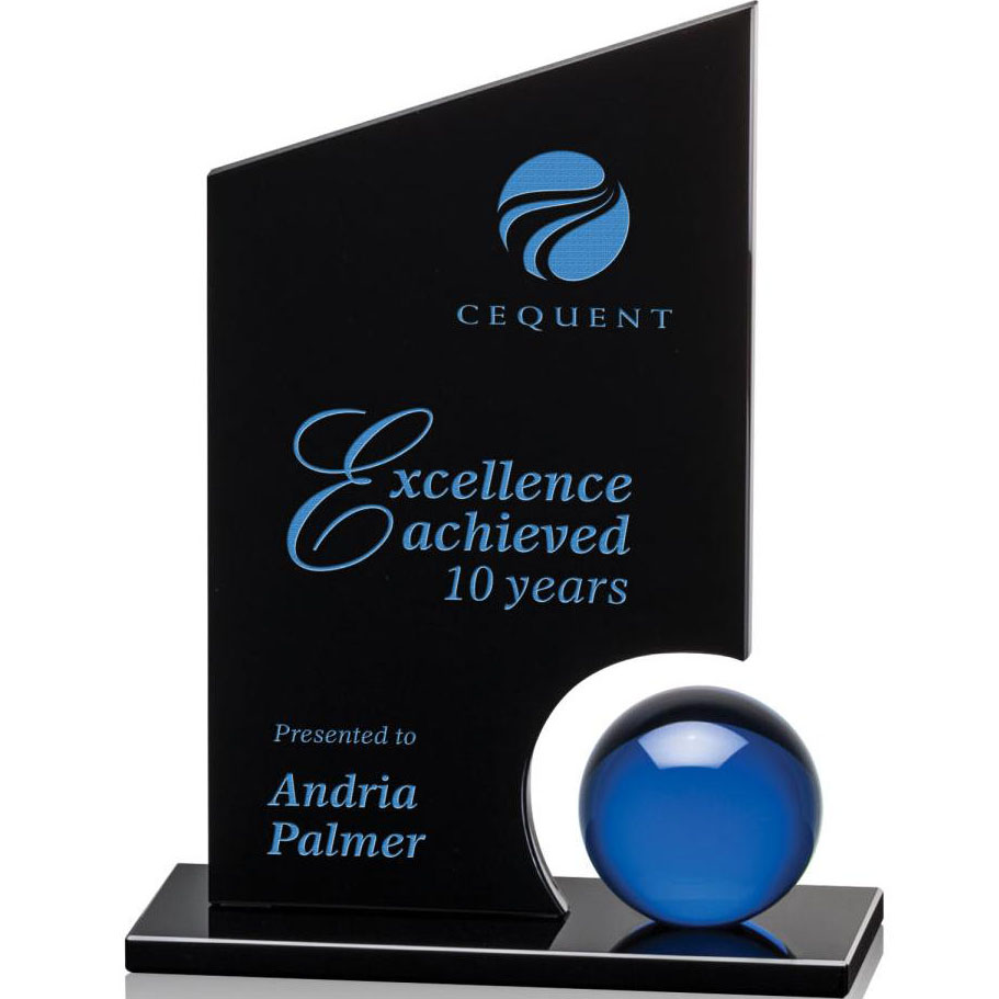 A gleaming crystal orb is mounted to our black optical crystal base and then surrounded with solid black crystal in this dramatic showcase of achievement. Price includes laser engraving.