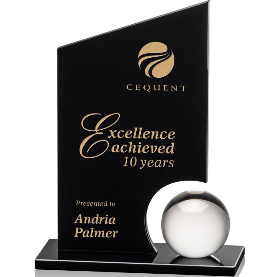 A gleaming crystal orb is mounted to our black optical crystal base and then surrounded with solid black crystal in this dramatic showcase of achievement. Price includes laser engraving.
