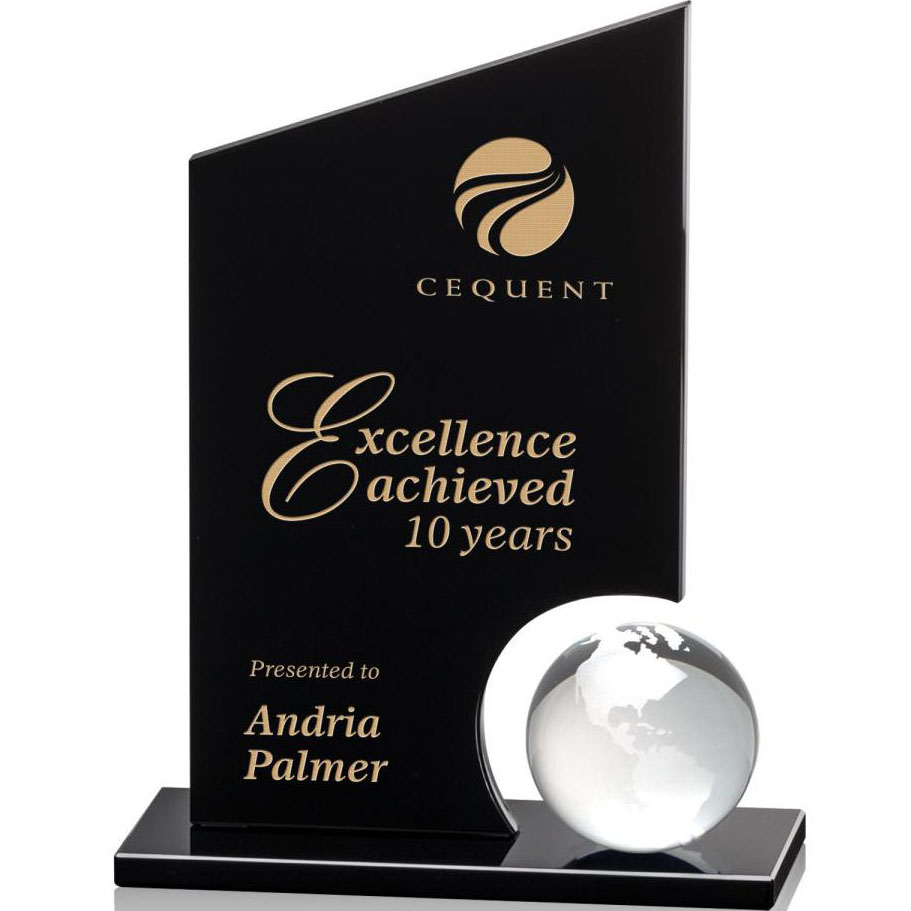 A gleaming crystal orb is mounted to our black optical crystal base and then surrounded with solid black crystal in this dramatic showcase of achievement. Price includes laser engraving.