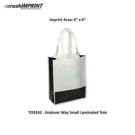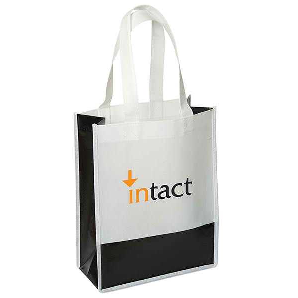 75 gram non woven and 35 gram laminated non woven Polypropylene. White self-material Non woven shoulder straps. Square bottom base. Coloured 3.5" H strip at bottom of bag.