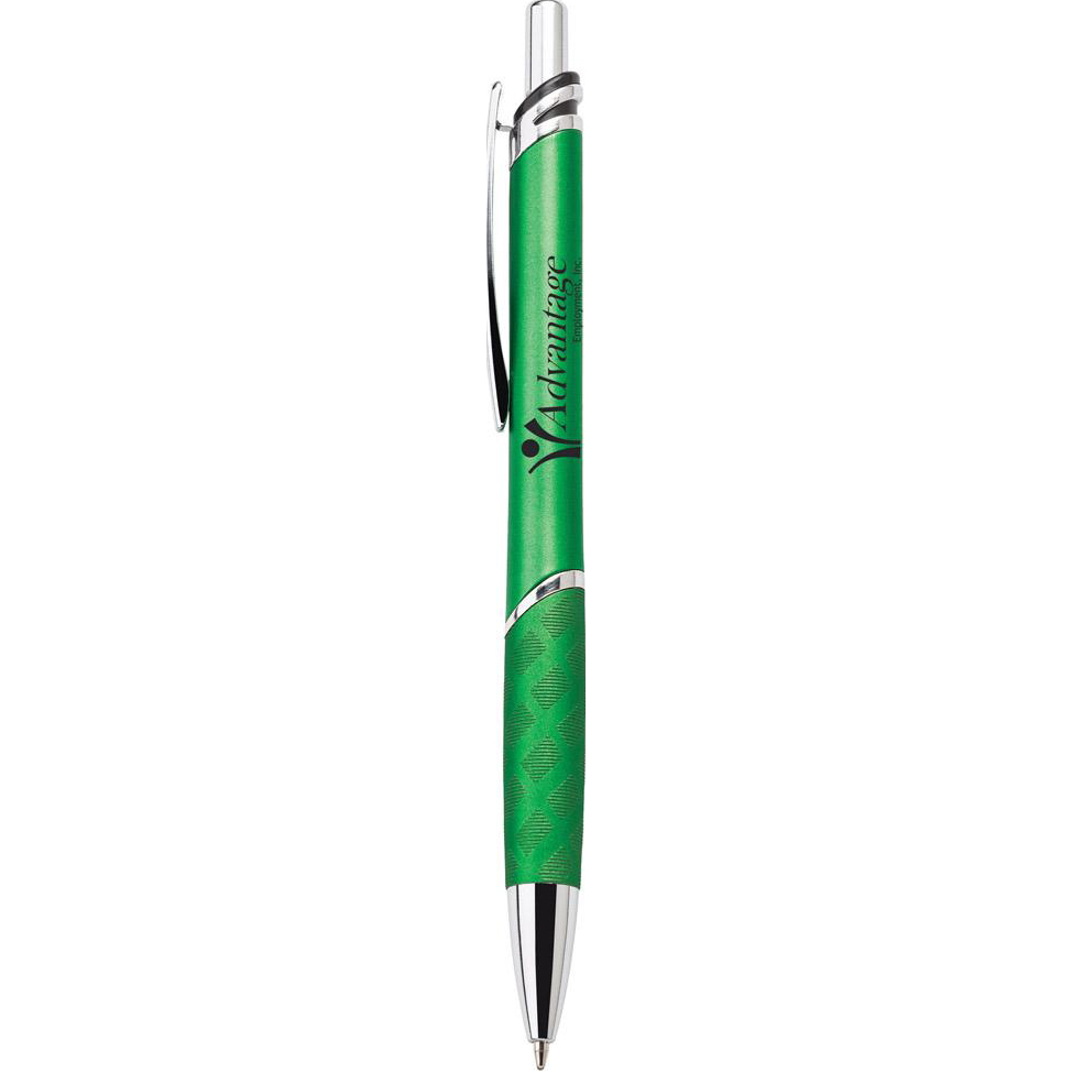 Standard: Bulk (100 units per bag). Standard medium point blue ink refill. This heavyweight (18.5 grams) push-action ballpoint plastic pen has a matte metallic finish, matching rubberized textured grip, chrome trim and a black accent. Price includes one colour, one location imprint.