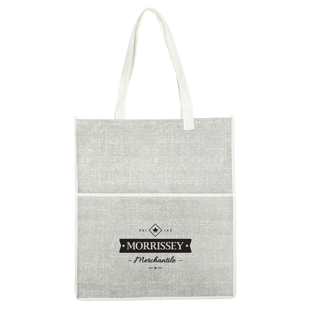Embrace the natural charm of the Apollo Recycled Non-Woven Convention Tote, a unique take on non-woven bags. This large tote, adorned with a natural print, is perfect for carrying all your essentials. Boasting a spacious open compartment and an additional front pocket for extra storage, this versatile tote is designed to meet all your needs. Material: recycled non-woven 80g polyester. 12" handle drop. Open main compartment. Integrated pen loop. Price includes one colour, one location imprint.
