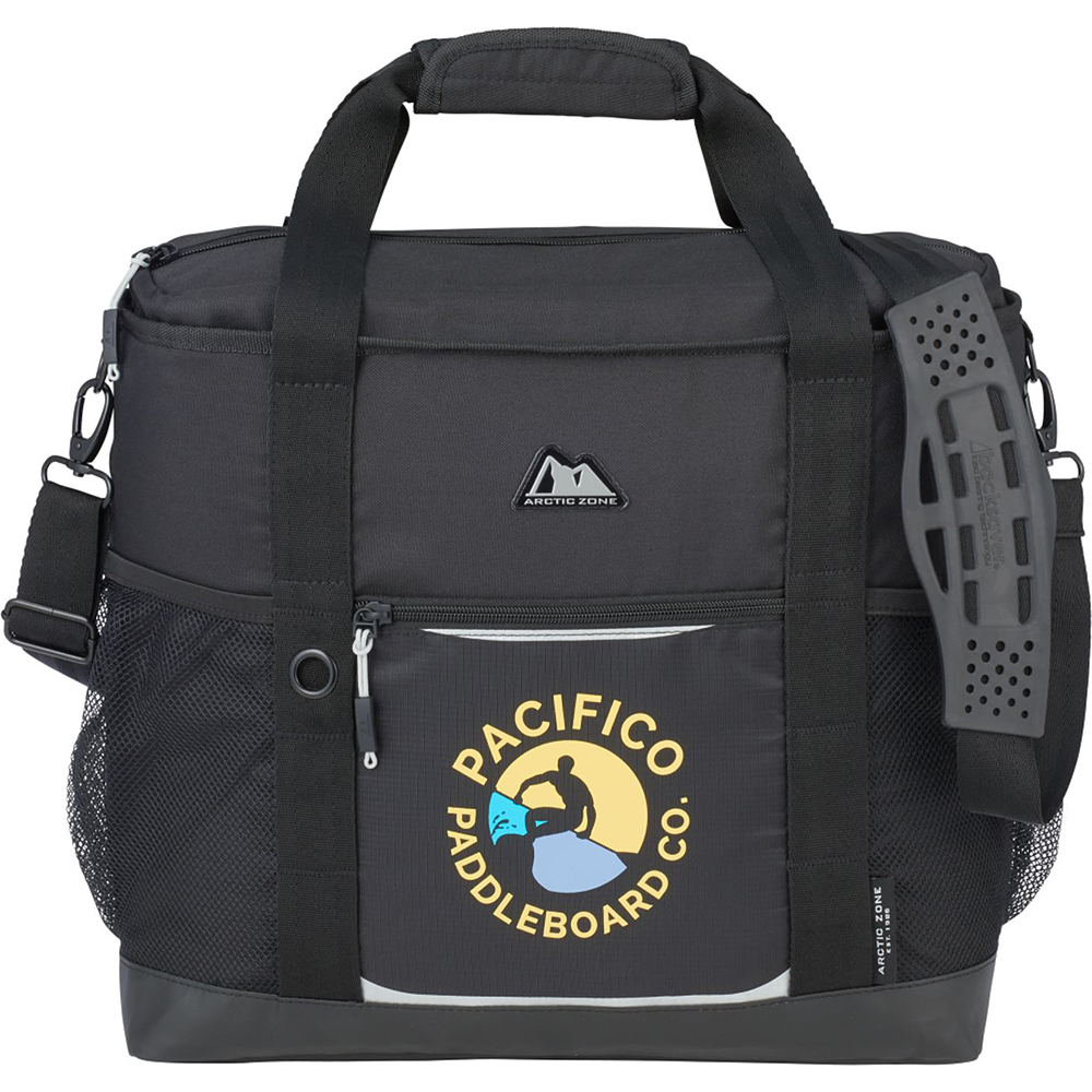 The Arctic Zone 30 Can Ultimate Sport Cooler features a sturdy, PEVA lining that keeps contents cold and prevents leaking. The cooler is easily portable with an adjustable shoulder strap and grab handles. The Ultimate Sport Cooler can hold up to 30 cans with a zippered main compartment, two side mesh pockets and a front zippered pocket. Material: 600d Polycanvas. Customizable logo placement. Easy clean PEVA lining. Front zippered pocket and side mesh pockets for extra storage. Convenient grab handles with adjustable shoulder strap. Features: Large zippered top for easy access and cleaning. Adjustable shoulder strap with extra padding. Waterproof PEVA lining. Front accessory pocket. Side mesh pocket. Sturdy padded grab handle. Fits up to 30 cans.