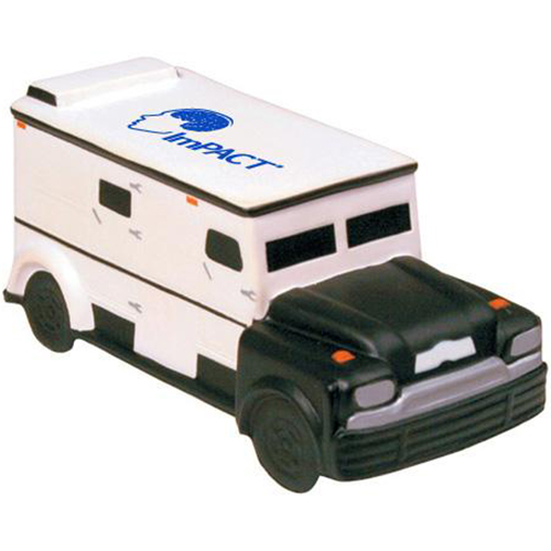 Custom stress ball - 1.5"x 4"- 0.1 lbs. Shaped like an armoured car. Imprint dimensions: 2" x 1". Price includes one colour imprint. Free art proof will be emailed with every order within one business day. In white/black colour combination. A minimum of 150 stress balls in 7 days. No duties, no fees.