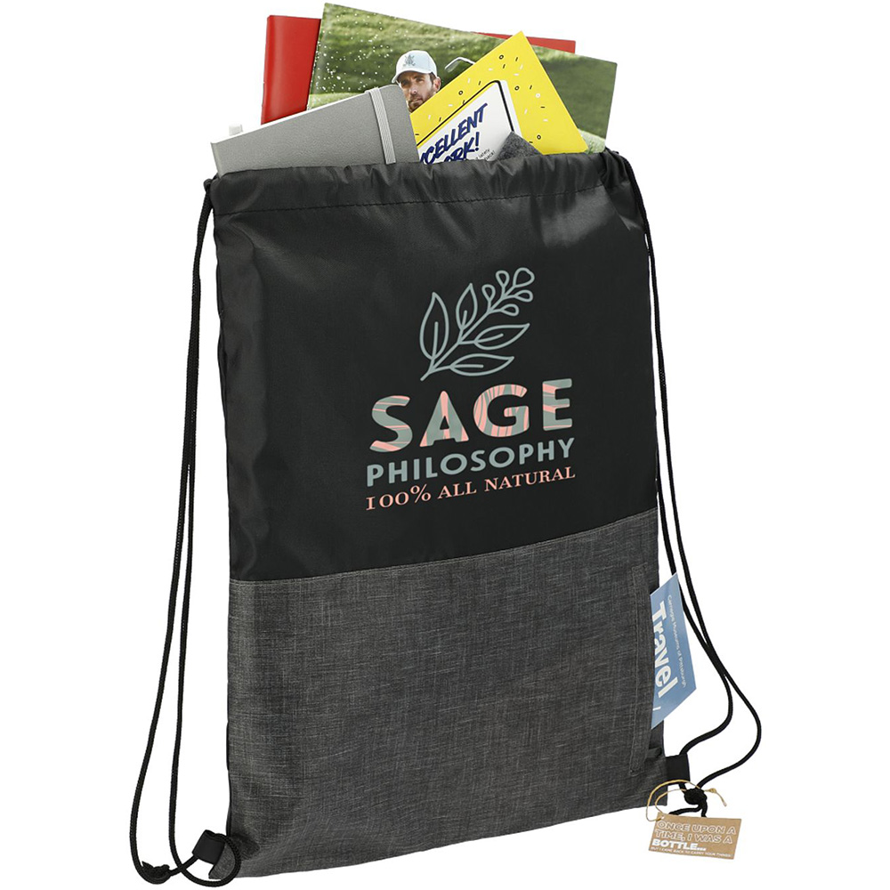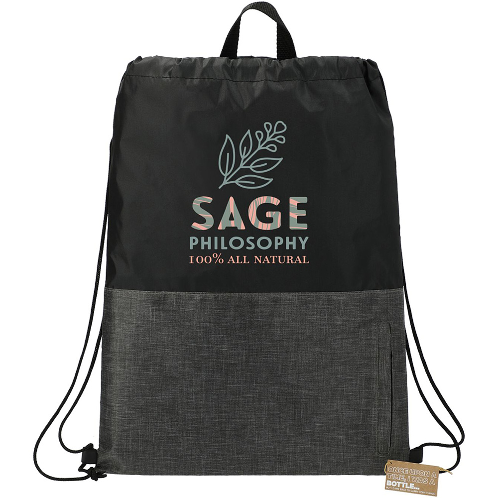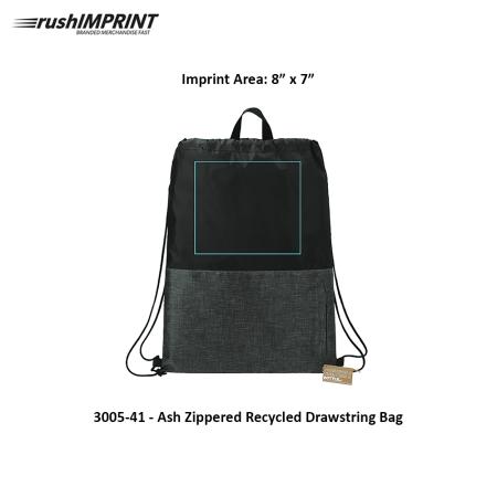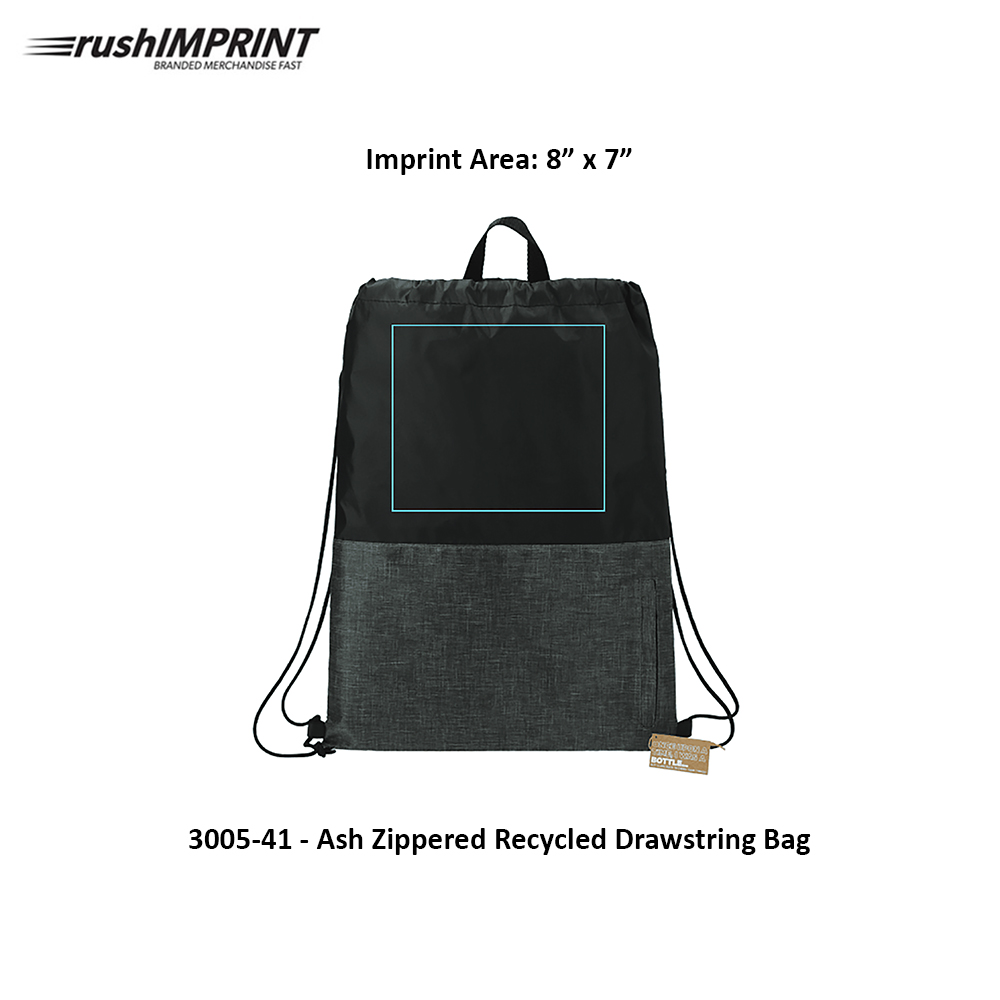 The Ash Zippered Recycled Drawstring Bag features a vertical zippered front pocket to hold your essentials. This drawstring bag is made from recycled water bottles. This lightweight yet durable bag cinches shut tightly with an easy-to-use drawstring design. Through a partnership with 1% For The Planet one percent of sales of this and all EcoSmart products will be donated to nonprofits dedicated to protecting the planet. Material: Recycled 210d Polyester. Vertical zippered front pocket. Lightweight and portable. Tightly cinching drawstring closure. Price includes one colour, one location imprint.