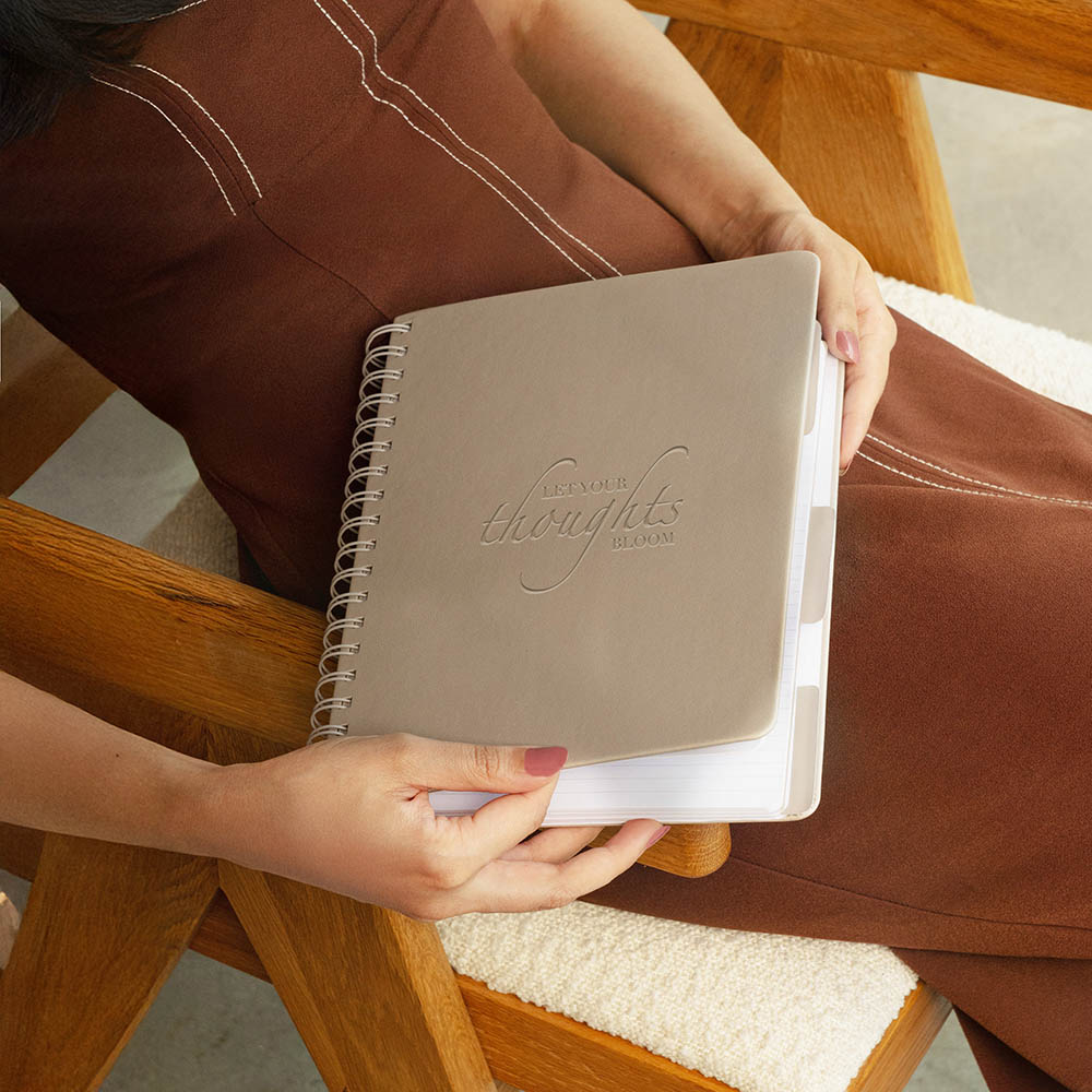 Organized, elevated. With its 7.375" x 9.75" thermo PU cover, tonal painted spiral binding, and 3 built-in dividers, the Aspen Journal blends form and function across 240 perforated 100g FSC-certified pages with a built-in date feature for everyday structure, reduced ink bleed-through, and improved legibility. Perfect for breaking down big ideas. Price includes debossing.