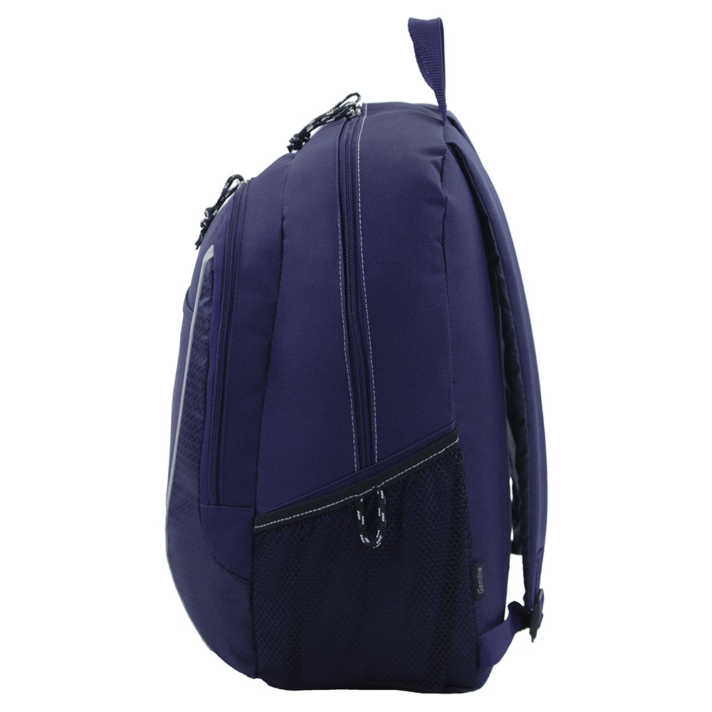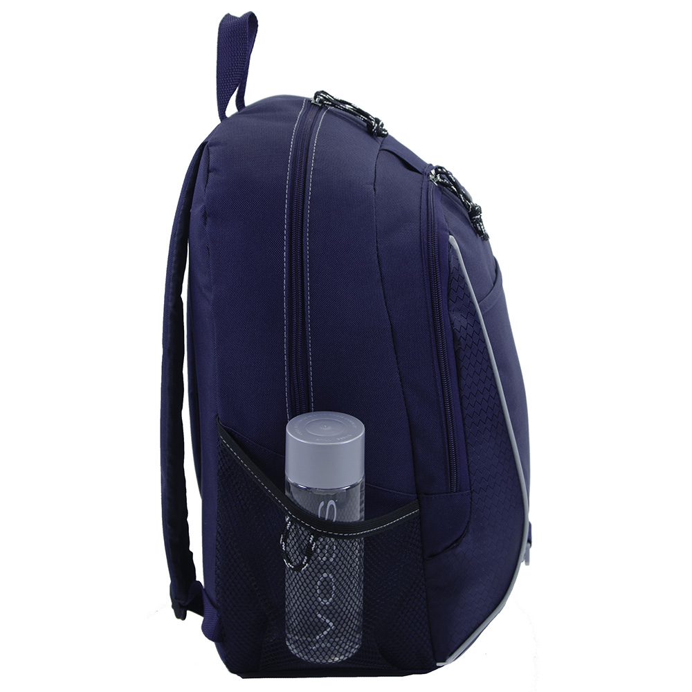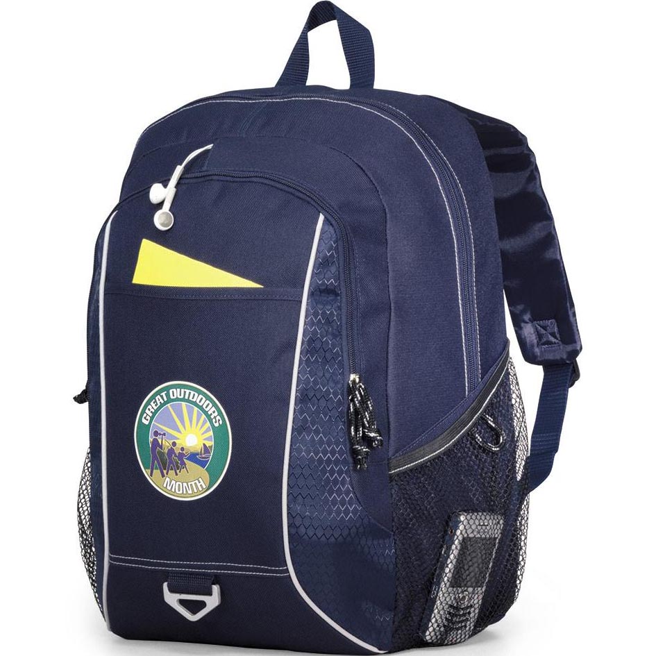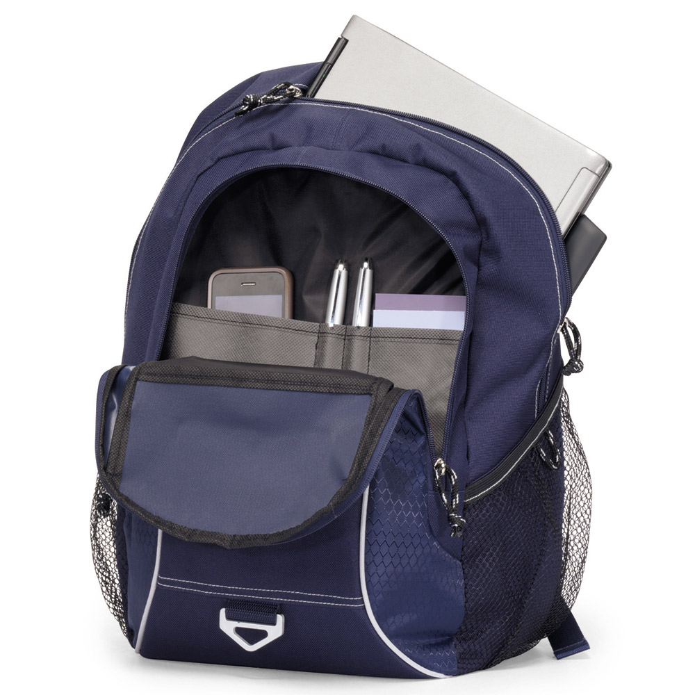 Rugged computer backpack designed for work or play. Large main compartment features padded computer sleeve (sleeve size: up to 15.4" laptop). Dual side mesh pockets for water bottles (water bottle not included). Front pocket and tri ring for keys. Zippered front pocket with multi-function organizer and earphone outlet for MP3 player. Padded back panel for extra comfort. Adjustable, padded shoulder straps and top grab handle. 600D Polyester / 410D Honeycomb Dobby material. Price includes one colour imprint, one location.