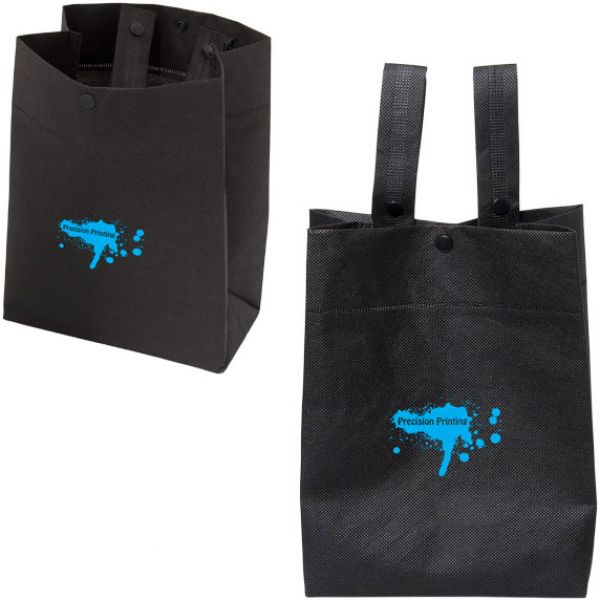 Non woven 75 gram Polypropylene. Straps are stitched and heat-sealed reinforced. Two straps that attach with snap closure around your headrest posts. Can also be hung from gear shift or other convenient locations. Snap closure to main compartment to contain odours and contents. Perfect for commuters, cab companies and families.