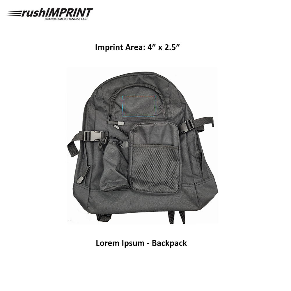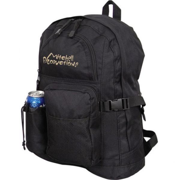 600D Polyester. Top zipper opening and two additional front zippered compartments. Mesh open pocket on single front gusset pocket. Built-in water bottle holder. Adjustable compression straps to manage pack load. Inside organization pocket with key clip. Deluxe adjustable padded back straps. Convenient top grab handle. Padded bottom base. Zipper pulleys. Bottles and cans not included. Price includes one colour, one location imprint.