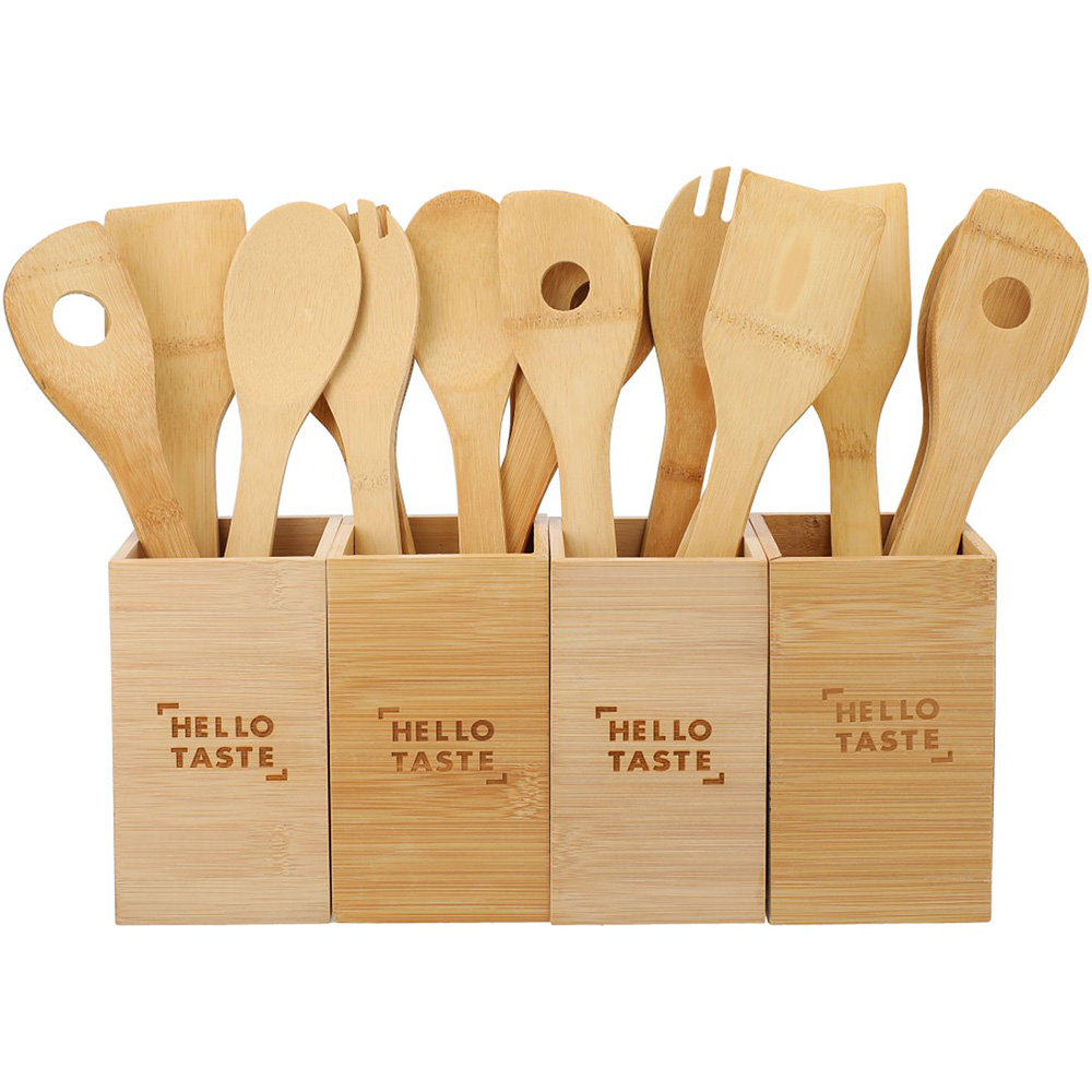 The classic Bamboo 4-piece Kitchen Tool Set and Canister includes four durable utensils, each measuring 11.8", conveniently stored in a durable bamboo canister. Tools included are a rounded fork, single hole mixing spoon, turner spatula and spoon. This is the perfect accessory to any kitchen. Due to the nature of the bamboo material, variations in laser imprinting quality may occur. Material: Bamboo. Durable canister for storage. 11.8" rounded fork, single hole mixing spook, turner spatula, and spoon. Due to the nature of the bamboo material, variations in laser imprinting quality may occur.