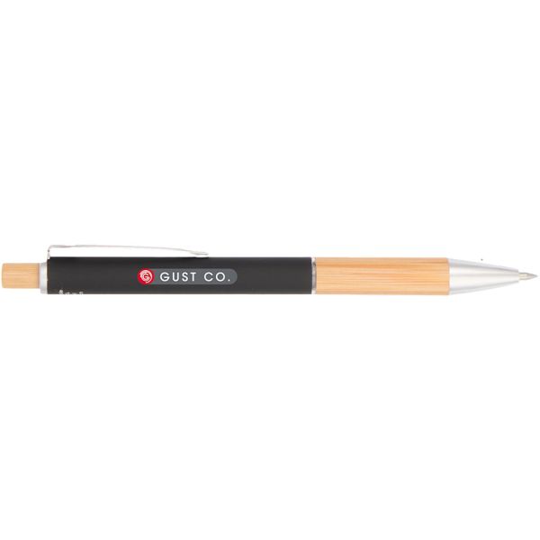 The Bamboo and Recycled Aluminum Soft Touch Ballpoint is a sustainable writing instrument with a 94% recycled aluminum barrel, FSC bamboo grip and clicker with sleek chrome accents. Aluminum barrel has a soft touch coating for ultimate comfort while writing. Features a precise 0.5mm writing tip which delivers smooth blue gel ink and 150-meters of writing length. By choosing this pen, you're making a positive impact on the environment, as one percent of sales are donated to environmental nonprofits through a partnership with 1% For The Planet. 94% recycled aluminum barrel, FSC-certified bamboo grip and clicker with sleek chrome accents. Aluminum barrel has a soft touch coating for ultimate comfort while writing. 0.5mm writing tip delivers smooth blue gel ink. 150-meters of writing length. Price includes full colour imprint.