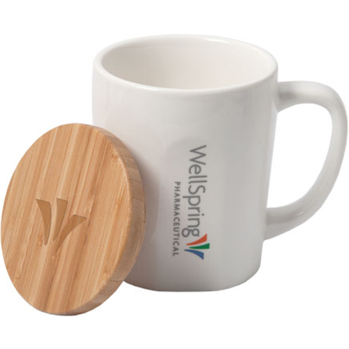 Ceramic with a glossy finish. Holds up to 444 ml. (15 oz.). Bamboo lid can also be used as a coaster, FDA compliant. Individually boxed. Dishwasher safe (mug only). Use lid while tea is steeping and to keep your beverage warm. Price includes one colour, one location imprint.