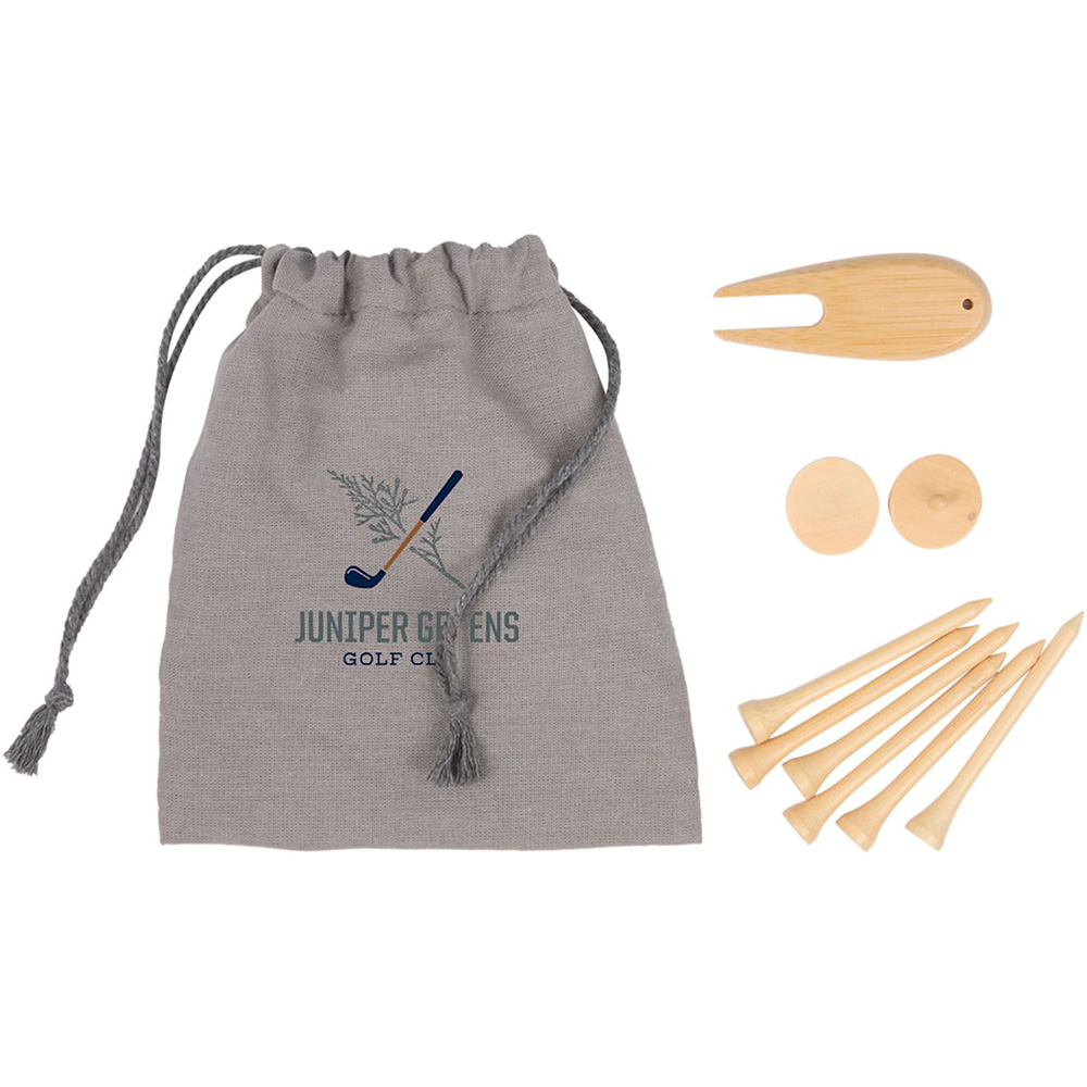 The Bamboo Golf Tee Set with Recycled Pouch is the perfect gift for golf events! This eco-friendly set includes six bamboo tees (measuring 2.75"), a durable divot tool, and two ball markers, all secured in a convenient recycled PET drawstring pouch. This set not only meets your on-course needs but also supports environmental nonprofits through a partnership with 1% For The Planet. Features: Complete bamboo tee set - includes six 2.75" tees, one divot tool, and two ball markers. Compact and lightweight - fits easily in golf bags for on-the-go convenience. rPET drawstring pouch and naturally sustainable bamboo tees.