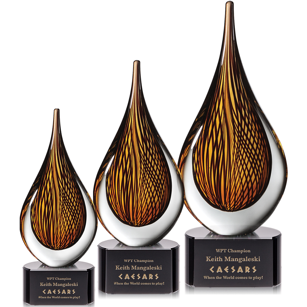 As a conspicuous alternative to the usual range of awards consider our family of fantastical art glass pieces! Their meaning may be puzzling but their function is clear: these are eye-catching decorative conversation pieces appropriate to a wide range of decors. With geometries from sublime to exotic color palettes from monochrome to kaleidoscopic and vibrant color and bubble infusions in a variety of patterns there is a style pleasing to any taste. While the "template" for each design is fixed each piece is individually hand formed and colored so that each piece is in fact quite unique. A quality optical glass base provides an etchable surface for presentation of logos and personalizations. Price includes laser engraving.