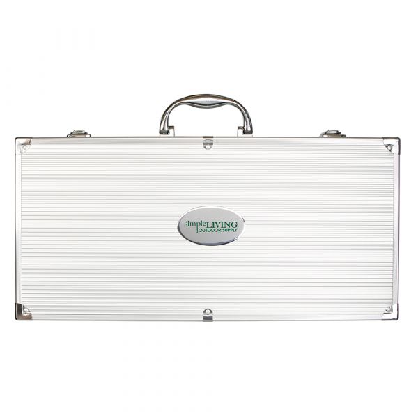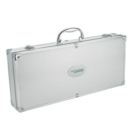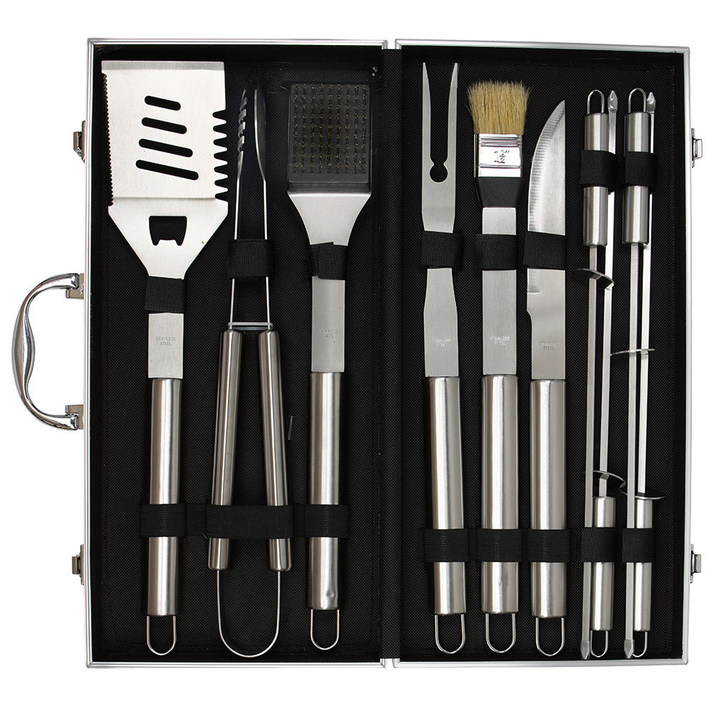 Perfect for your next BBQ, this 10-piece set has everything you need, including tongs, spatula, fork, basting brush, and 4 skewers. Sturdy case. PRODUCT MATERIALS: Case: Aluminum; Utensils: Stainless Steel. Price includes one colour, one location imprint.