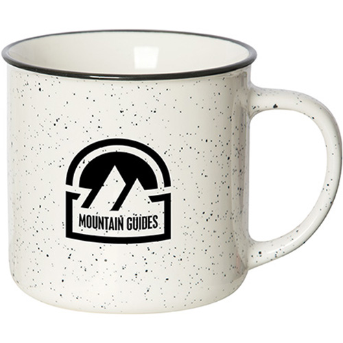 Stoneware. Glossy exterior coffee mug with coloured speckles and rim. White glossy interior. C' shaped handle. Holds up to 350 ml. (12 oz.). A practical and useful item that will be seen everyday. FDA compliant. Dishwasher safe. Microwave safe. Price includes one colour, one location imprint.