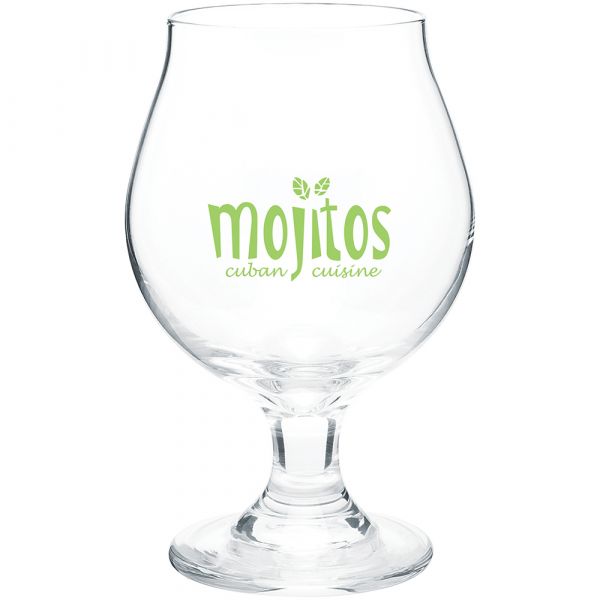 16 oz belgian beer. Hand wash recommended. Do not microwave with metallic imprint (glitz). Price includes one colour, one location imprint.