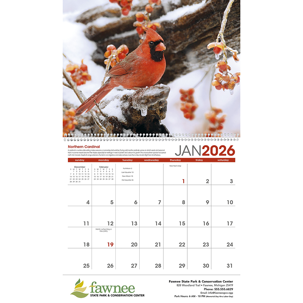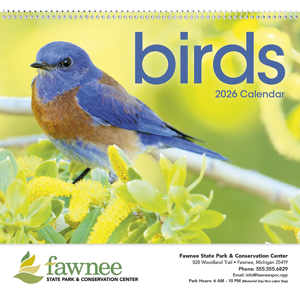 This intriguing, unique calendar features a variety of beautiful birds and is sure to be a big hit with both nature lovers and bird watchers. The photos are accompanied by interesting information about the birds pictured. Price includes one colour imprint.