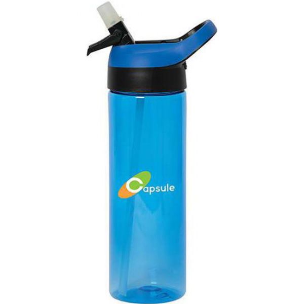 Tritan. Auto push button on lid with drinking spout. Lid screws on/off and has a built-in carry handle. Bottle body is transparent. Holds up to 650 ml. (22 oz.). BPA free and FDA compliant. Instructions included. Dishwasher safe bottle. Price includes one colour, one location imprint.