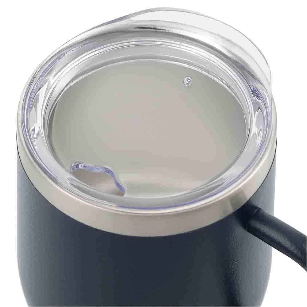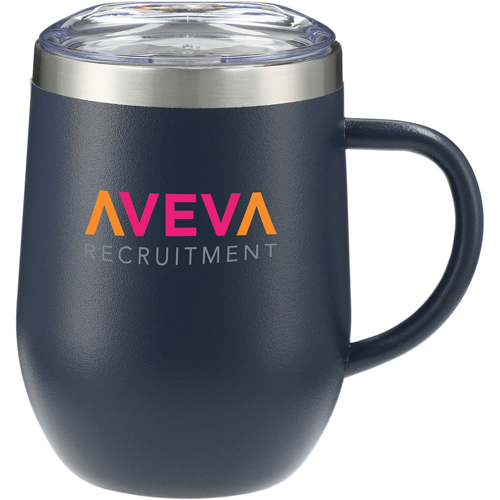 Durable, double-wall stainless steel vacuum construction with copper insulation, which allows your beverage to stay cold for 24 hours and hot for at least 6 hours. Features the durable stainless steel handle design. The construction also prevents condensation on the outside of the piece. On-trend, durable powder coating. 12oz. Material: 18/8 GradeStainlessSteel. Price includes one color, one location imprint.