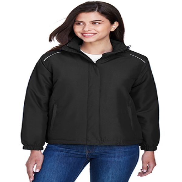 Reflective piping and reflective zipper toggles offer 360 degrees visibility. Roll-away hood provides versatility when the weather is unpredictable. Brushed tricot lining offers added warmth and softness. Elasticized cuffs offer protection from the cold. EZEM system for tidy embroidery.