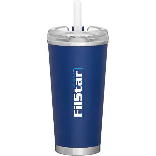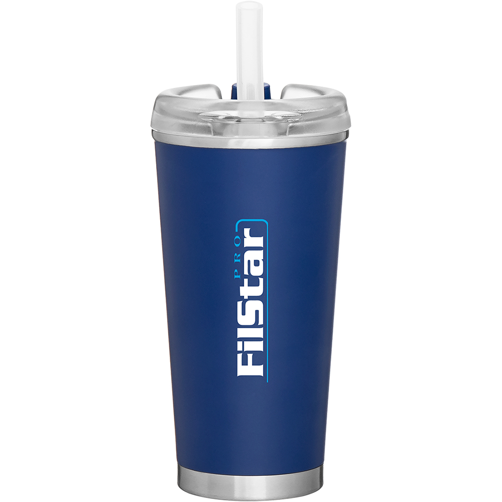 16.9 oz double wall 18/8 stainless steel thermal tumbler with copper vacuum insulation, stainless steel rim and base, threaded Eastman Tritan lid, snap closure, straw opening, and flexible wide silicone straw