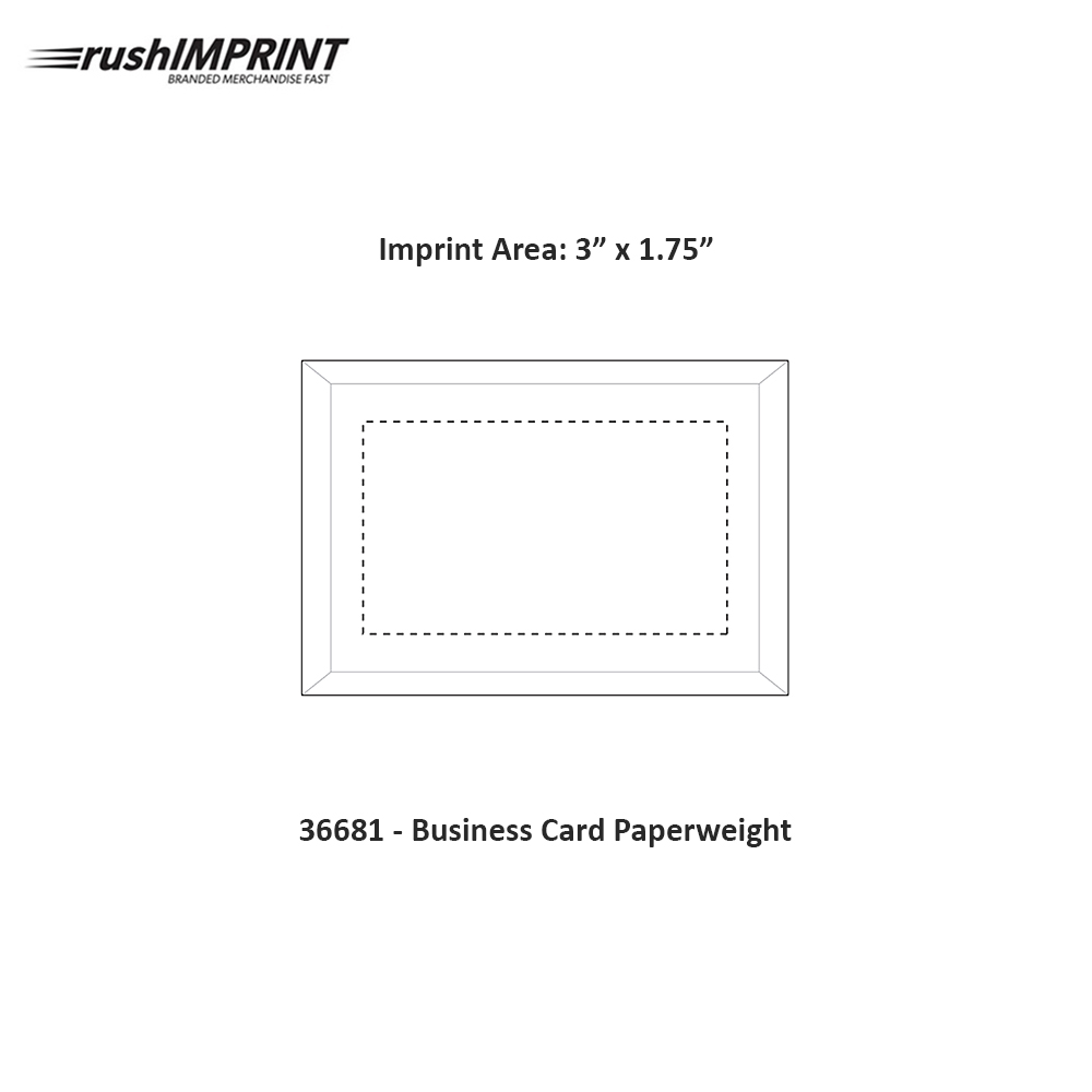Model: 36681 Business Card Paperweight Product Description A paperweight is a creative and unique way to display your business card. Create a colorful 3D effect by imprinting both back and front sides. Shown with britePix back and deep etch front, additional charges apply. Price includes laser engraving. Size: 1.75"h x 3"w Imprint Area: 1.75"h x 3"w Request A Virtual Proof Choose Quantity View Price Breaks Quantity Price 6 $51.59 12 $48.37 50 $45.14 100 $43.53 250 $41.92 Enter quantity or drag slider. Minimum quantity is 6. Quantity: Price Each $51.59 Setup Charge: $0.00 Subtotal $309.54 Savings: $ over minimum qty pricing Choose Your Quantity Quantity Price 6 $51.59 12 $48.37 50 $45.14 100 $43.53 250 $41.92 Standard Production Time: 7 business days Select Delivery Date Enter Postal Code Apply Loading... Choose a Shipping Method -- Loading Shipping Prices -- Customize it! Upload Your Art Now Or Send it Later. Select Imprint Colour(s) Back to Edit Product Color And Quantity Where on the item should we print your design? 3" x 1.75" Available print design areas 3" x 1.75" Quantity: 6 Add Your Artwork Add Artwork Add Now Send After Checkout Don’t have artwork? That’s ok! Artwork is not required to start a job. Simply skip this step and email us artwork later (info@rushimprint.ca). If you need assistance with your art, our designers can help with that too! Will I be able to approve my design before it goes into print? Yes! You will receive a digital mock-up of your artwork on this item within a few hours of placing your order. We will send your order into production only after you approve the mock-up. Only Image Aa Only Text Aa Text/Image Designer Contact Us Enter Your Text Choose file Uploading logo. Please wait... Personalize your design by adding text and customizing its shape with a curve. Upload your logo to give it a professional touch, and combine these elements to create a one-of-a-kind design that’s uniquely yours. Open Product Designer Don’t have artwork? That’s ok! Artwork is not required to start a job. Simply skip this step and email us artwork later. If you need assistance with your art, our designers can help with that too! Will I be able to approve my design before it goes into print? Yes! You will receive a digital mock-up of your artwork on this item within a few hours of placing your order. We will send your order into production only after you approve the mock-up. Free art proof will be emailed with every order within one business day Total (loading...) qty x Set Up Shipping Cost Rush Charge Custom Fields Hazmat Fee Estimate arrival Savings Add to Cart Updating Price...