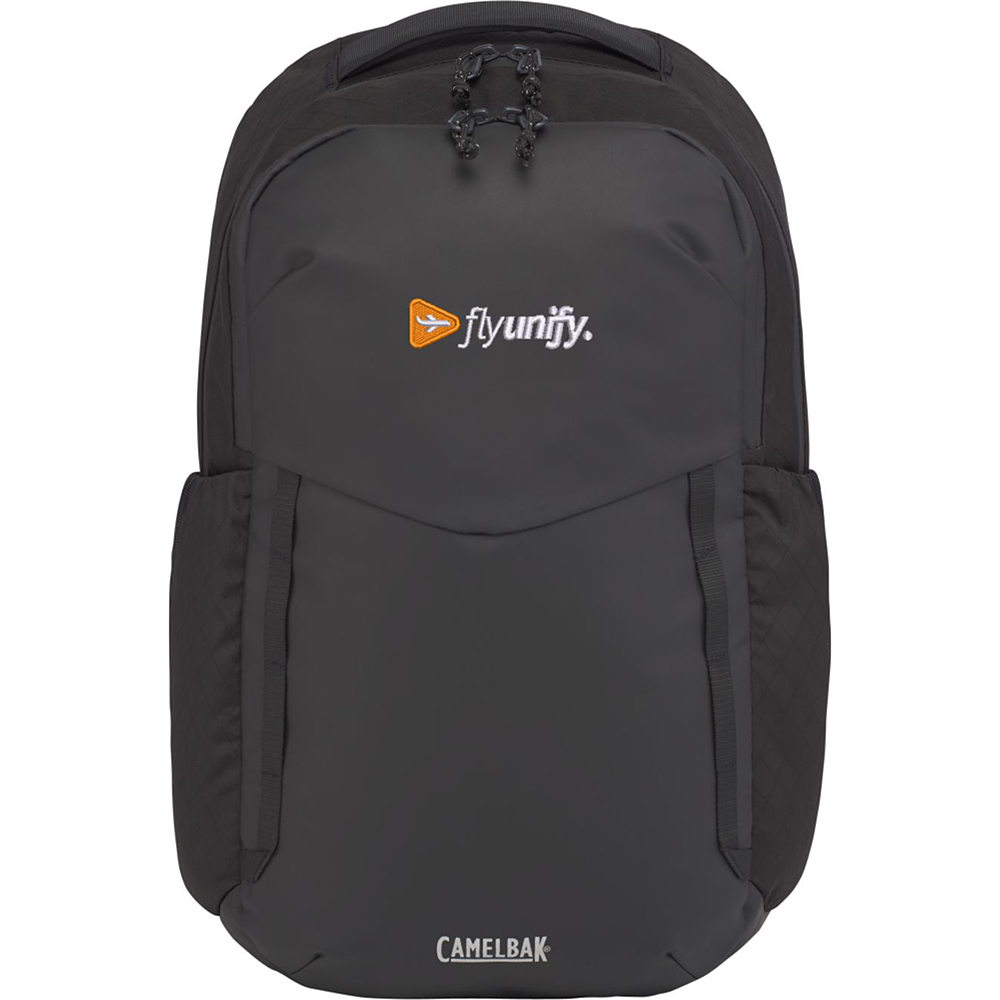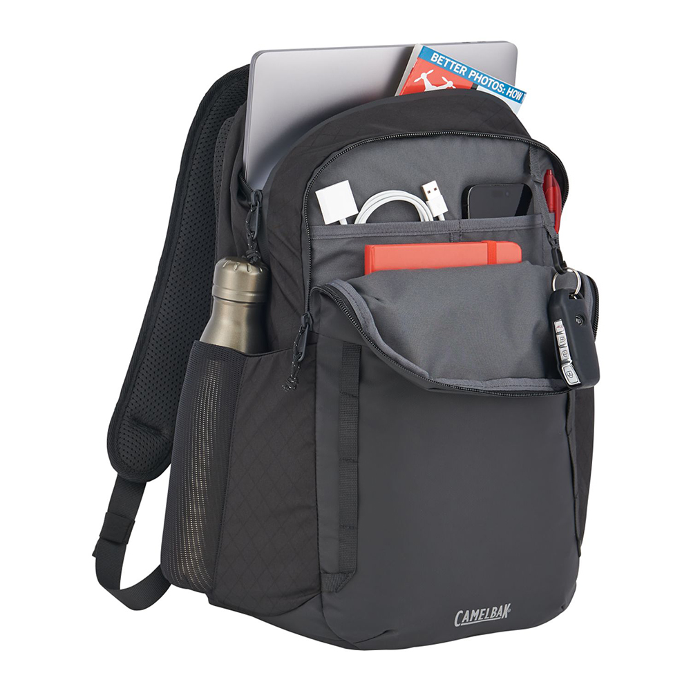 The CamelBak DEN 15" Laptop Backpack is made from coated RPET polyester. A front zippered pocket offers organization and extra storage for quick access. The main compartment includes a 15" padded laptop sleeve. There are two side pockets for water bottles or extra gear. Trolley strap attaches to your luggage or use the padded, adjustable shoulder pads to carry this bag. Through a partnership with 1% For The Planet, one percent of sales of all EcoSmart products are donated to environmental nonprofits.