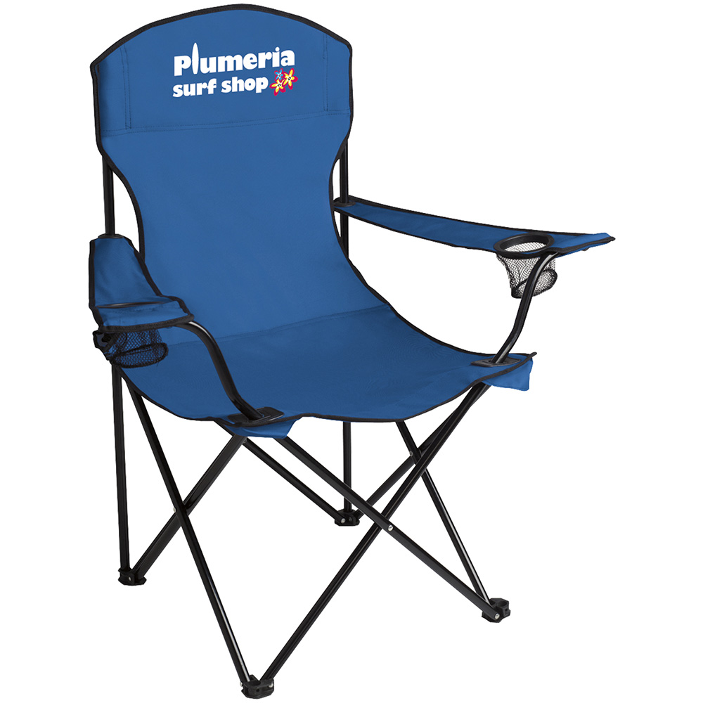 Relax in the great outdoors in the privacy of your own back yard, at the lake or your favorite game! More than a chair, it features 2 can holders, a zippered pocket and its own carrying case. Folding chair with arms has a 300 lb. weight limit 2 mesh can holders and zippered mesh pocket Comes with nylon carry bag, with strap and drawstring. Price includes one colour imprint.