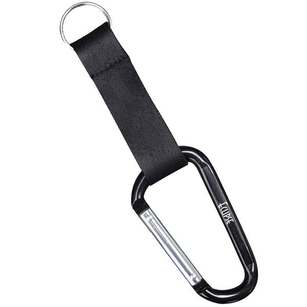 Quality Custom Keychain featuring heavy-duty carabiner with removable key ring and strap. Min. of 250 pcs. Choose between Black and Royal colours. Personalized Keychain imprinted price includes imprint on carabiner. Not to be used for climbing. Bulk packed when shipped. Price includes one colour imprint, one location. Pad print method. 1.5" x 0.15" imprint area.